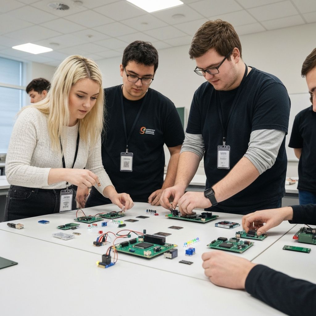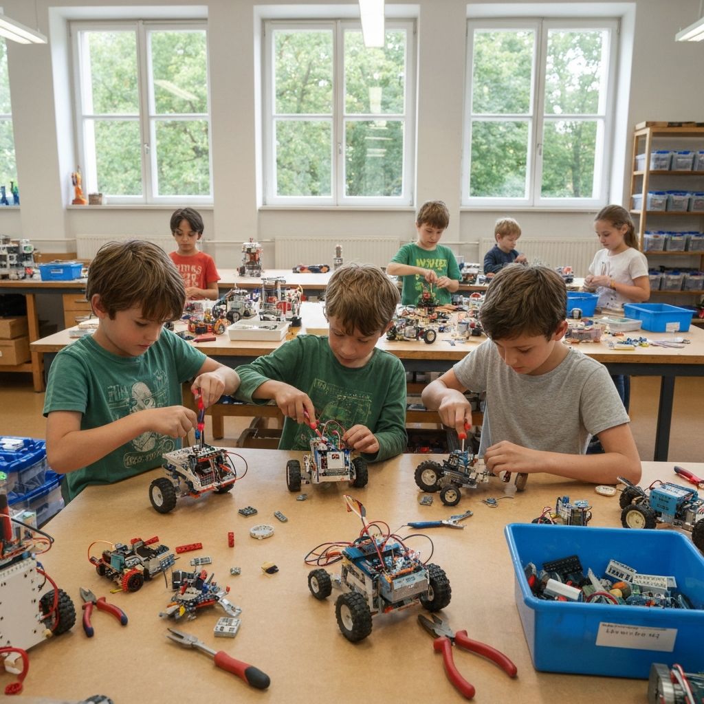 Students building robots in workshop